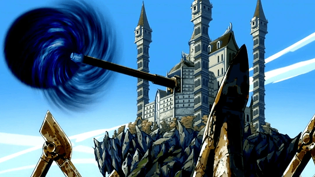 La guilde sort et voit le bâtiment du Phantom Lord s'avancer vers eux. Les Mages de Fairy Tail sont tous sous le choc car personne n'a prévu la situation. José ordonne le tir de Jupiter. Erza s'attend à un spectacle horrible, elle se transforme en Armure d'Adamantine et se prépare à encaisser le coup. Jupiter tire et Erza intercepte l'impact.