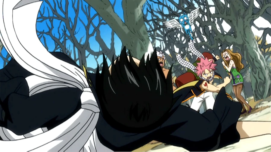 Le jeune homme inconnu de tous se tient devant Natsu, Elfman et Ever Green qui sont allongés sur le sol, venant tout juste d'éviter une attaque meurtrière de la part du mystérieux personnage. L'homme est extrêmement ému, en larmes, tandis que Natsu le regarde, très énervé. Happy arrive en se demandant ce qu'il se trame, il devait se rendre au sommet avec Natsu normalement. Natsu est confus, il ne sait pas trop ce qu'il se passe mais a senti quelque chose de vraiment très étrange. Tout le monde vient de remarquer que tout l'écosystème autour de lui est mort, la magie de ce mage ôte la vie. Cela fait froid dans le dos, tout le monde s’interroge, qui est t-il ? Natsu lui crie que cette île appartient à leur Guilde et qu'il n'a pas le droit de perturber l'examen en cours. Le mage mystérieux lui évoque qu'il a gagné en puissance et bien grandi… Il voulait le rencontrer et évoque Natsu à la fin de sa phrase. Natsu, énervé, se jette sur lui et le frappe d'un violent coup direct, ce qui étonne les autres. Il l'a tapé sans raison. L'homme comprend alors que Natsu n'est pas encore prêt à le détruire, c'est encore trop tôt, puis il se relève avec agilité, comme si de rien n'était. Natsu ne connaît pas le nom de cet homme et il veut à tout prix le savoir. Pendant que Natsu lui demande comment il s'appelle, le mage inconnu se parle tout seul. Il révèle qu'il ne veut plus tuer personne et que Natsu était le seul à pouvoir l'arrêter. Il relève la tête lentement et en tremblant, ses yeux sont en larmes, à la surprise du groupe, qui trouve que cet individu fait froid dans le dos. Tout à coup, une branche d'un arbre situé tout près du jeune homme se met à craquer, ce qui le surprend et lui fait dégager sa magie noire. Se tenant la tête de ses deux mains, il ordonne aux mages de Fairy Tail de fuir le plus vite possible. Après ces paroles, sa magie semble lui être hors de contrôle et prend de l’ampleur. Tout le monde fuit mais Natsu se voit engloutit par la vague de magie. Happy veut voler à son secours mais Elfman le retient et court le plus vite possible pour pouvoir échapper à cette vague mortelle. Les arbres touchés pour la deuxième fois en viennent à disparaître de la surface de la terre.