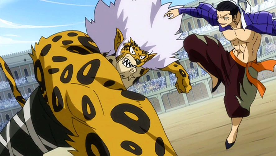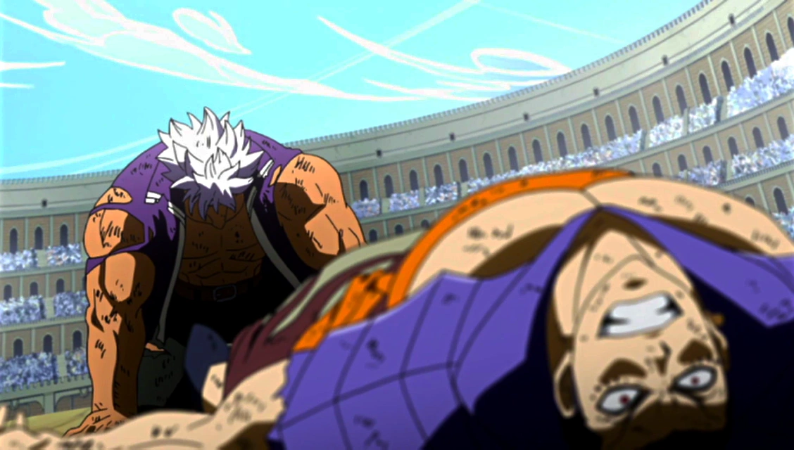Kanna crie à Elfman de se relever. Le Take over d'Elfman est alors annulé car il a utilisé une grande quantité de puissance magique, mais aussi car l'attaque qu'il vient de recevoir était puissante. Elfman se relève et dit alors à Bacchus qu'ils n'ont toujours pas décidé ce qu'Elfman gagnerait s'il sortait vainqueur de ce combat. Bacchus lui dit qu'il n'y a aucune chance pour que cela arrive, alors il lui dit qu'il peut choisir ce qu'il veut. Elfman annonce alors que s'il gagne, leur guilde se nommera "Quatro Puppy" durant les jeux magiques. Kanna approuve totalement. Bacchus décide alors de prendre le combat au sérieux et boit l'alcool qu'il y avait dans sa gourde. Erza, Grey et Lucy s'inquiètent alors pour Elfman. Bacchus fonce sur Elfman, qui utilise une nouvelle fois sa magie. Tout le monde est étonné par la puissance de Bacchus. 7 coups en une fraction de seconde... Mais au lieu qu'Elfman soit blessé, c'est Bacchus qui reçoit les dommages, car Elfman a utilisé "Lizardman", il est donc recouvert de puissantes écailles.