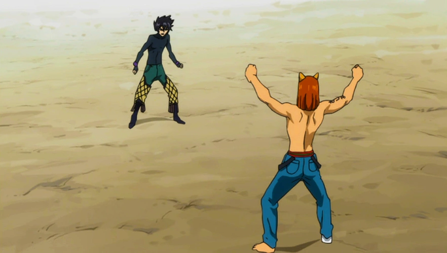 Pendant ce temps, Natsu se réveille avant de remarquer qu'il est seul. Il sent alors l'odeur de quelqu'un d'inconnu dans la pièce, et se précipite dehors, avant de retrouver des hommes étranges ayant pris avec eux Polyussica, Wendy et Carla. Il les rattrape et les bat, avant d'appeler les gardes pour qu'ils s'occupent d'eux. Il apprend ensuite que les hommes étranges travaillaient pour Raven Tail. Wendy se réveille elle aussi, et ils observent le match depuis là où ils sont.