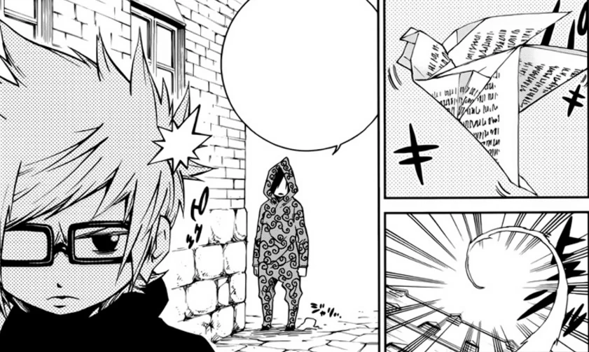Les trois garçons s'envolent soudainement dans de géants ballons, ne touchant plus le sol. Les adversaires mentionnent le nom de l'inconnu, Wakaba Mine, Mage de Fairy Tail. Confus, Grey ne comprend pourquoi ce même mage disait tant de mal sur sa propre guilde et aussi, il reconnu la voix sous le capuchon. On comprend vers la fin du chapitre qu'il s'agissait de Pauze Lightless. Ils disparaissent (Pauze et deux autres mages avec lui), laissant Grey, Doronbo et Wakaba au sol.