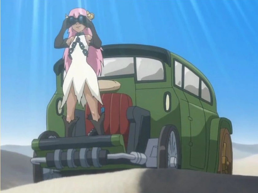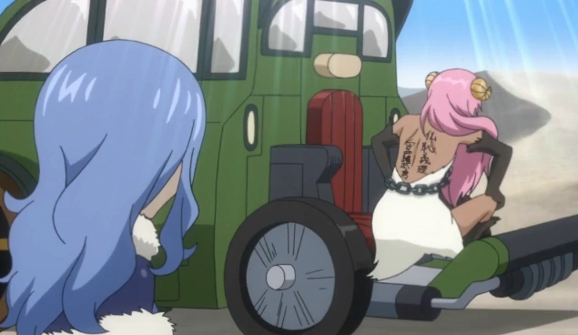 Elle détache alors la chaîne qui était autour de son cou et l'attache à celui de Jubia. Elle attache ensuite la chaîne à l'arrière de son véhicule et traîne la Mage d'Eau à pleine vitesse derrière l'engin. Ariès lui demande ironiquement si ça va, car ce tour en voiture est un tour amusant qui permet de rentrer chez soi quand on est faible. Elle s'arrête après quelques sauts à travers les dunes de sable et s'étonne que la Mage soit déjà K.O. Elle lui dit cependant qu'elle a un certain esprit combatif pour crier comme ça. Laissant échapper un petit rire sadique, l'Esprit ajoute qu'elle pense lui donner le coup de grâce. Jubia laisse alors échapper deux mots " De l'eau ", signe qu'elle est en déshydratation. Ariès lui répond qu'elle n'a pas de chance, car il n'y a pas une seule goutte d'eau dans se désert, ou qu'en d'autres mots, elle peut oublier la réhydratation.