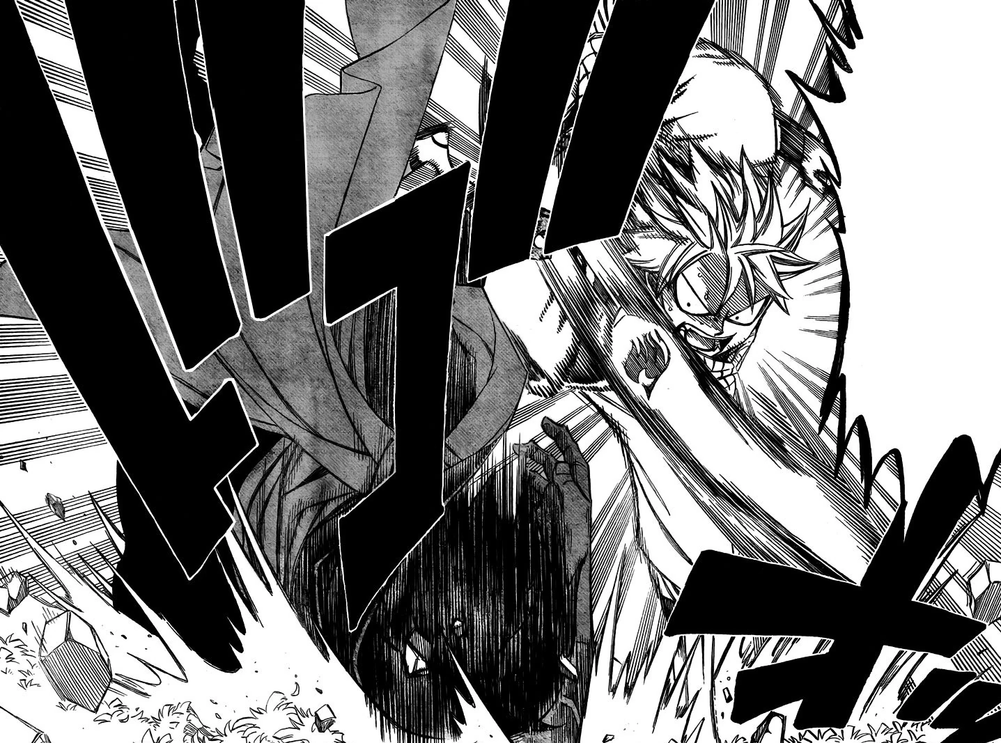 À son tour, Natsu lui tient un discours similaire à celui que venait de lui tenir Ever Green et Elfman, à savoir, il ignore qui il est mais l'île sur laquelle il se trouve est la leur alors qu'il ne vienne pas les perturber pendant leurs épreuves. En guise de réponse, l'homme lui dit qu'il a bien grandi. Toujours très calme alors que les trois mages ont un sentiment de colère mêlé à une crainte légitime du fait de ce que semblent être les capacités de cet homme, il poursuit, il voulait le voir, concluant son apostrophe par le prénom de Natsu, comme pour lui montrer qu'il le connait.
