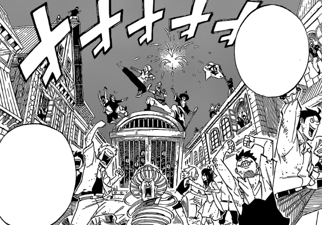 Au sud de Fiore, à Harujion, Erza se réveille avec difficulté. Kagura souriante lui dit de ne pas en faire trop et de se détendre. Wendy et Carla l'informe que ses blessures étaient très profondes et que ça lui prendra du temps pour récupérer complètement. Grey amusé leur dit qu'elles ont toutes les deux vu des meilleurs jours également, mais Jubia lui fait remarquer qu'il est à moitié nu et Risley Law lui fait remarquer à son tour que c'est également son cas. Soudain Miliana arrive et prend Erza dans ses bras et Grey l'informe qu'ils ont réussi à libérer Harujion et que le port est maintenant sous leur contrôle. Il lui explique que Gerald et les autres sont encore en train de chasser les restes des troupes d'Arbaless, mais que ce n'est plus qu'une question de temps avant qu'ils ne soient tous éliminés. Il ajoute que pour le moment, ils vont retourner à la guilde et Jubia le rejoint en disant qu'elle s'inquiète sur leur situation. Risley de son côté dit à Wendy qu'ils peuvent se reposer et laisser le reste à Mermaid Heel et à Lamia Scale. Erza tente alors de se lever, mais Kagura lui dit qu'elle ne peut pas car elle a besoin de temps pour récupérer.