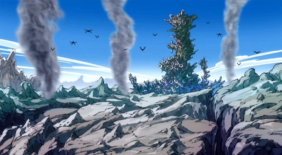 Le quartier général de Raven Tail a subi des modifications notables dans l'anime : les terres désolées qui l'entourent sont sillonnées de grands gouffres, d'où s'élèvent d'épaisses colonnes de fumée. La forteresse elle-même est profondément transformée : elle est nettement plus étroite et semble composée d'immenses coraux, avec une tour centrale particulièrement haute et élancée[11].