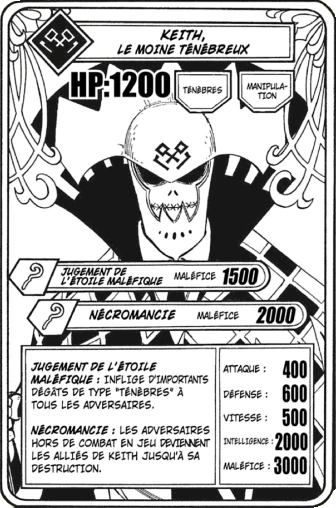 - Dans les bonus du Tome 46, Mashima a imaginé les membres de Tartaros en tant que cartes, dans l'esprit des Cartes Pokémon. Ainsi, Keith aurait 1 200 Points de Vie et ses attaques " Jugement de l'Étoile Maléfique " et " Nécromancie " auraient respectivement 1 500 et 2 000 de puissance.